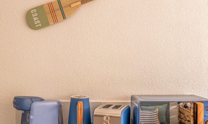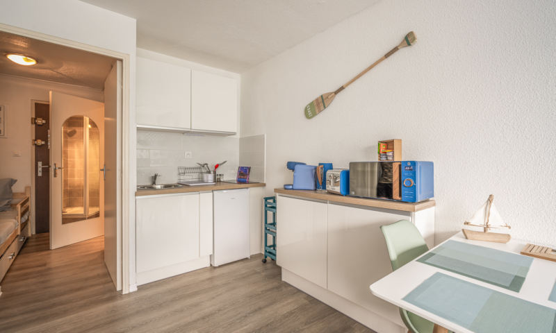Cuisine équipée : frigo, four micro-ondes + machine tassimo + bouilloire + grille-pain